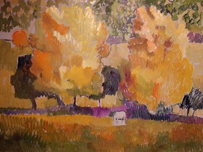 My colors in this underpainting are laid in loosely and mixed with MG Underpainting White and Turpentine using a variety of bristle brushes. Colors in the trees: Cadmium Yellow, Cadmium Orange, Cadmium Red, Yellow Ochre, Burnt Sienna, Chrome Oxide Green Opaque. Shadows: Combination of Prussian Blue, Burnt Sienna, Diox. Purple and Chrome Oxide Green Opaque. This underpainting will need to dry completely (about a week) before I can work into the colors again with the glazes (darks). In the meantime I will complete “POPPY LOVE” and “MORNING POEM”.