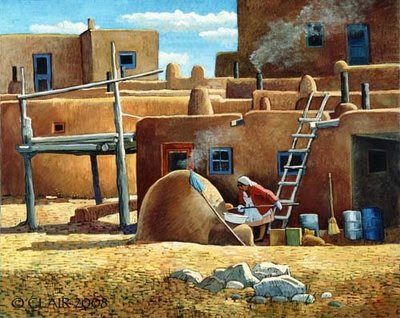 “OUR DAILY BREAD” – A friend and I visited Taos Pueblo many years ago on a very cold and windy January day — we bought the loaf of bread this lady was taking out of her horno and ate the whole thing!