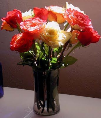5 September 2009 — Another year! Friend John sent these roses from LA — they are brightening my kitchen bookcase this morning — making me smile. This was one of those BIG birthdays that brought up a lot of strange feelings of getting older — one remedy for that is for me to get back to painting this coming week. Have replenished my paint supplies — gessoed my boards and canvases — have new material for new work. I want to continue with my 100 SMALL PAINTINGS and have several larger paintings in progress. Will begin new posts Tuesday – stay tuned.