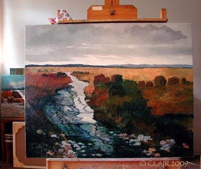 23 September 2009 – Making progress! Have concentrated on the top one-third of the painting. The sky and distant landscape are completed and, I believe, inform the light for the rest of the canvas. The middle ground – I have found some long forgotten tubes of Transparent Oxide Yellow and Transparent Oxide Red — Am also mixing Indian Red, Mars Orange, Ochre and Chrome Oxide Green Opaque. This painting is taking on a life of it’s own — it’s like the movie “The Red Shoes” — Moira Shearer couldn’t stop dancing and I can’t stop painting! DC