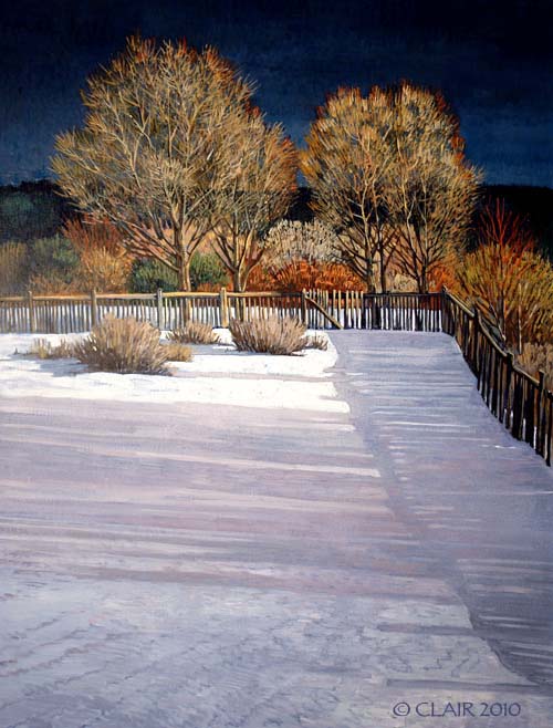 Began this canvas in January, although the source photo was made the year before….16 January 2010 – I didn’t want to miss this beautiful light I saw from my kitchen window last winter.  Grabbed my trusty digital camera and shot the photo right through the window.  The 48″x36″ canvas is gesso toned with Payne’s Grey.  The “cartoon” of the painting is Prussian Blue.  I ran the photo through my large Epson printer to get a 16″x20″ print of the photo as a point of reference.  Yesterday I placed a grid on the photo (not the canvas) to guide me in proportions.  This is one of the five large canvases I want to complete this year.