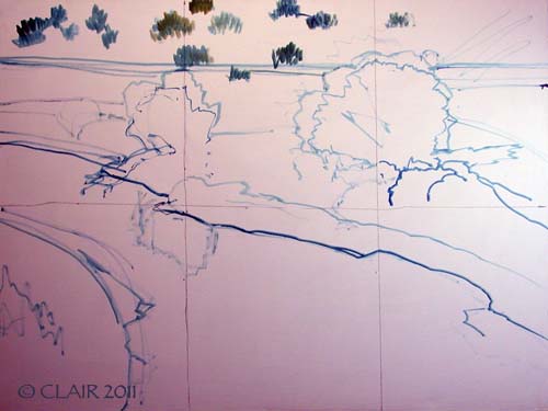 27 April 2011 — “ABIQUIU DREAMING” – NEW 30″X40″ OIL – Sketch on Belgian Linen canvas with a toned ground (gesso with Payne’s Grey). Loose sketch with Prussian Blue, some Burnt Sienna and turpentine. Stay tuned!