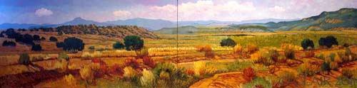Studio #1611- “PEDERNAL” 24″x96″ Diptych (Work in Progress – the Glazes) — Thinning my oil colors with my painting medium (after letting the underpainting dry for at least a week to ten days), I cover the underpainting with glazes – transparent and semi-transparent colors. Trees: Prussian Blue, Burnt Sienna and some Chrome Oxide Green Opaque. Earth: Yellow Ochre, Rose Grey, Burnt Sienna and Dioxazine Purple for the shadows. Dry Shrubs: Cadmium Yellow, Yellow Ochre, Chrome Oxide Green Opaque.