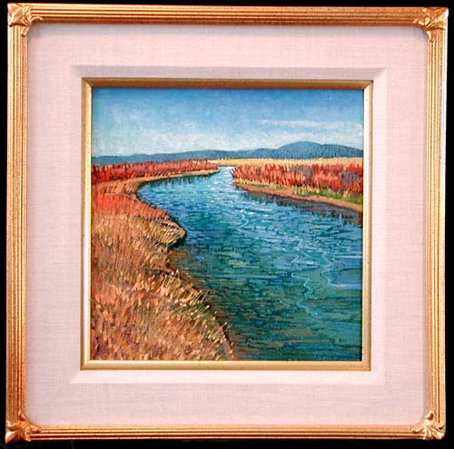 DEEP RIVER DREAMING- 12″X12″ Original Oil on Canvas, Framed in Gold with Linen Liner. $1300 plus shipping. Visa, Mastercard, Amer. Exp. available through my studio. For price and availability, please visit www.DonnaClairArt.com