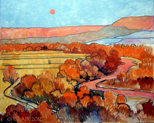 5 January 2012 – Basic colors mixed with Grumbacher MG Underpainting White. Sky: Cobalt Blue with a touch of Thalo Rose Red. Trees: Ochre, Cadmium Red, Burnt Sienna, some Prussian Blue and Cobalt Blue. Stay tuned!