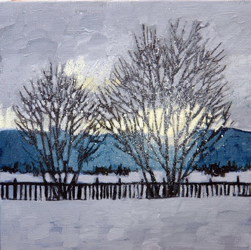 200 Small Paintings No. 88 – TAOS SUNRISE IN FIVE COLORS – Study for larger painting, 6″x6″ Original Oil on Linen Panel, Framed in Silver – Now available at Online Gallery.