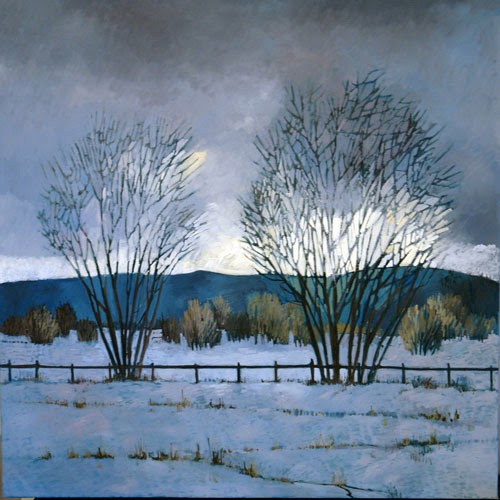 STUDIO NO. 2013 – TAOS SUNRISE – 36″x36″ Work in Progress (Opaque Colors) – Worked on this canvas all week and dropped the idea of using only five colors. Added Cadmium Yellow Light to the area where the sun is rising and will add some dry brush Holbein Rose Grey to the sky next week. Also added some Burnt Sienna and Alizarin to the grasses and trees. The paint is laid on rather thickly and needs to dry before I can work to bring out the early morning light. This is not a New Beginning as I thought when I blocked it in – it is the last painting from my kitchen window on Santistevan Lane — that makes it very special in my eyes. Hope you are enjoying this process. DC