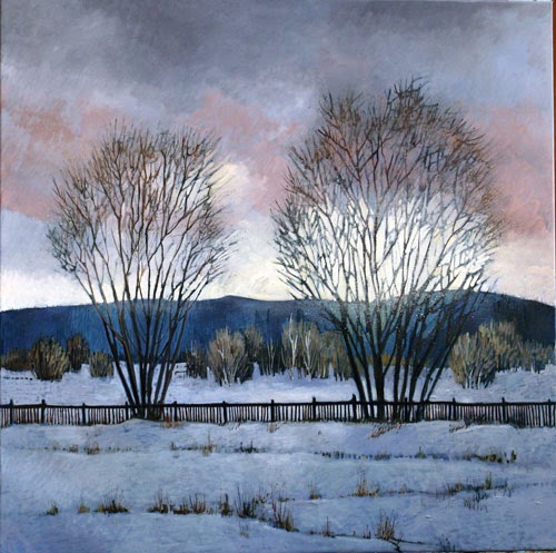 “TAOS SUNRISE” 36″x36″ Original Oil on Belgian Linen (wrap-around painting) – One last look through my Taos kitchen window..SOLD.