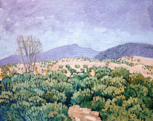 100 Small Paintings No. 99 – AND THE RAINS CAME (View of the Sangre de Cristo Mountains from Tesuque, New Mexico) 8″x10″ Original Oil on Panel unframed. – Sold