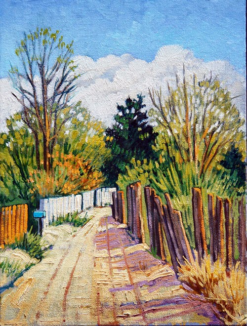 Studio No. 2414 – DOWN A COUNTRY LANE (Tesuque, New Mexico) – 12″x9″ New Original Oil on Linen Panel, Framed in Gold with Linen Liner. Click here to preview.