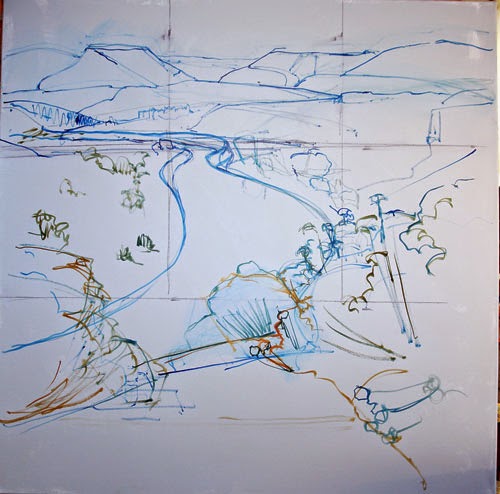 ABIQUIU – Work in Progress – sketch on 40″x40″ primed, gessoed and toned canvas. Very loose “cartoon” with Prussian Blue, some Burnt Sienna and turpentine.