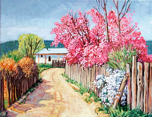 ROMERO ROAD IN APRIL (Tesuque Village, New Mexico) – 11″x14″ Original Oil on Belgian Linen – Sold