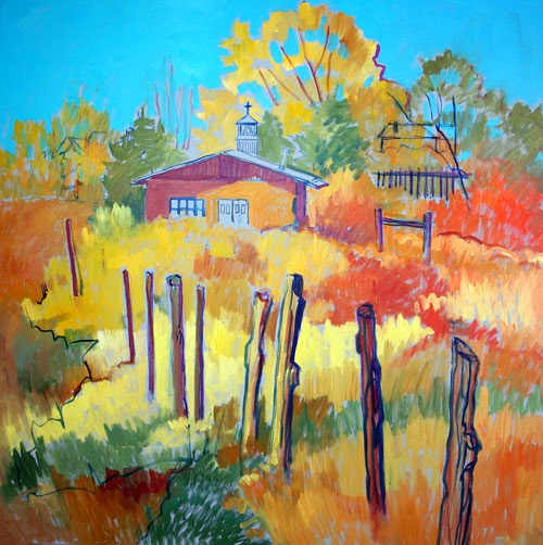 ASSEMBLA DE DIOS (Truchas, New Mexico) – 40″x40″ Work in Progress (Underpainting). Almost all colors are mixed with Winsor-Newton Underpainting White. Note: Am testing this new white – doesn’t dry as fast as Grumbacher MG. Sky: Thalo Blue, Thalo Green. Trees and Grasses: Cadmium Yellow, Cadmium Yellow Light, Cadmium Red, Burnt Sienna, Chrome Oxide Green Opaque and Yellow Ochre.