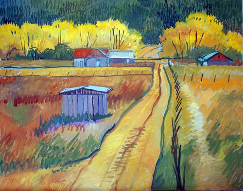 Studio No. 315 – COUNTRY LANE – 22″x28″ Orig. Oil on Belgian Linen. Work in Progress (Underpainting) – Colors are mixed with MG Underpainting White and Turp. – Pinon Trees: Chrome Oxide Green Opaque – outlined with Prussian Blue and Burnt Sienna. Fall Foliage: Cadmium Yellow; Yellow Ochre. Grasses: Combinations of Mars Orange, Yellow Ochre, Chrome Oxide Green, Olive Green, Cadmium Orange. Road: Mars Orange, Holbein Rose Grey, Burnt Sienna, Yellow Ochre.
