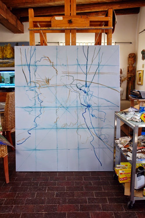 Studio No. 1115 – SANTUARIO (Rio Pueblo at Martinez Hacienda, Taos, N.M.) – 60″x50″ Work in Progress – Okay, here we go! This is a very loose sketch – working with distilled turpentine, Prussian Blue and Burnt Sienna. A long way to go before I begin to lay in the underpainting – tighten sketch – have the source material right next to the canvas where I can look at it all day long – imagining the darks in my head – they are the strongest element of the composition.