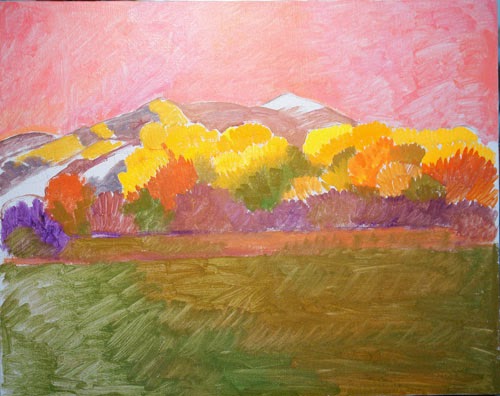 TAOS EVENING LIGHT – 16″x20″ Original Oil on Belgian Linen – Work in Progress (Underpainting) – Color notes: All colors are mixed with MG Underpainting White and Distilled Turpentine. Sky: Cadmium Red. Trees: Cadmium Yellow, Cadmium Red and Cadmium Orange. Darker Trees: Brush with yellow colors on it (dirty brush) and Dioxazine Purple. Foreground: Yellow Ochre, Burnt Sienna, Prussian Blue, Olive Green.