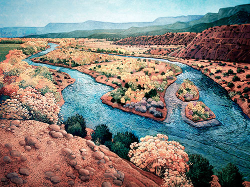 RIO CHAMA AT ABIQUIU (Abiquiu, New Mexico) – from an original oil painting – new print, greeting cards and related products now available at Fine Art America.