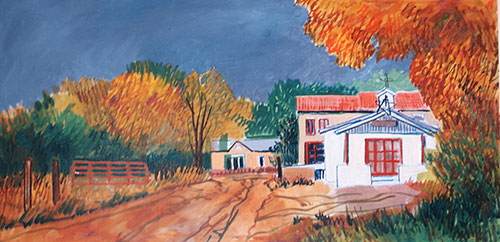 Studio No. 1615 – RIO CHIQUITO – 12″X24″ Oil – Work in Progress (Glazes) – Sky: Payne’s Grey, Prussian Blue, Permalba White. Autumn Trees: Italian Pink, Burnt Sienna, Cadmium Red, some Chrome Oxide Green, Opaque. Road: Burnt Sienna, Yellow Ochre, Burnt Umber. Dark Trees and Grasses: Prussian Blue, Burnt Sienna, Chrome Oxide Green Opaque.