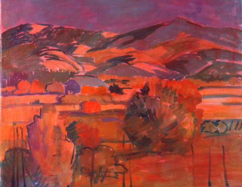 Step #1 – Studio No. 216 – NOCHECITA DE TRUCHAS – 16″X20″ Work in Progress. Using MG Fast Drying Underpainting White mixed with basic colors and thinned with turpentine. Color Notes: Sky: Cerulean Blue. Mountains: Prussian Blue, Burnt Sienna (mix these two colors together for an intense dark green) chrome oxide green opaque, Yellow Ochre. Bottom half of painting: various mixtures of the colors above.