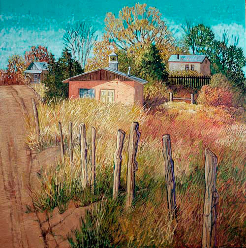 ASSEMBLA DE DIOS (The old Assembly of God Church – Truchas, New Mexico – PS: I had my studio in the little house to the left of the church) – 40″x40″ Original Oil on Canvas, framed – Preview/Purchase.