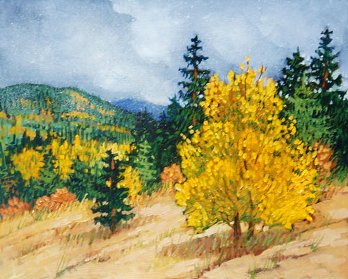 Studio No. 1716 – EARLY SNOW CLOUDS (Hyde Park – Santa Fe, New Mexico) – New 8″x10″ Original Oil on Italian panel, framed – Preview/Purchase.