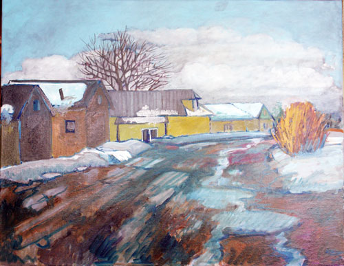 STUDIO NO. 317 – CALLE DE TRUCHAS – 22″x28″ Work in Progress (Glazes) – This phase of the painting is where I lay in the dark transparent or semi-transparent colors with fast drying oil painting medium which I mix myself. Foreground road and adobe buildings – Burnt umber, ultramarine blue, prussian blue, burnt sienna, some mars orange and some ochre. Establishing the darks, which should make the lighter opaque paints pop right off the canvas!