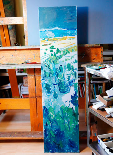 Studio No. 717 – OVERLOOK (Truchas, New Mexico) – New 48″x12″ Original Work in Progress (Underpainting). Color Notes: Using Grumbacher MG Fast Drying Underpainting White and Distilled Turpentine – Sky and Snow: Paynes Grey, small amounts of Prussian Blue. Trees: Combinations of Prussian Blue, Burnt Sienna, Chrome Oxide Green Opaque. Stay tuned!