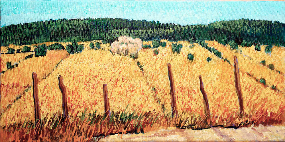 LOS CAMPOS DEL LLANO (Llano San Juan, New Mexico) 8″x16″ Original Oil on Canvas, framed in gold with linen liner – Preview Painting.