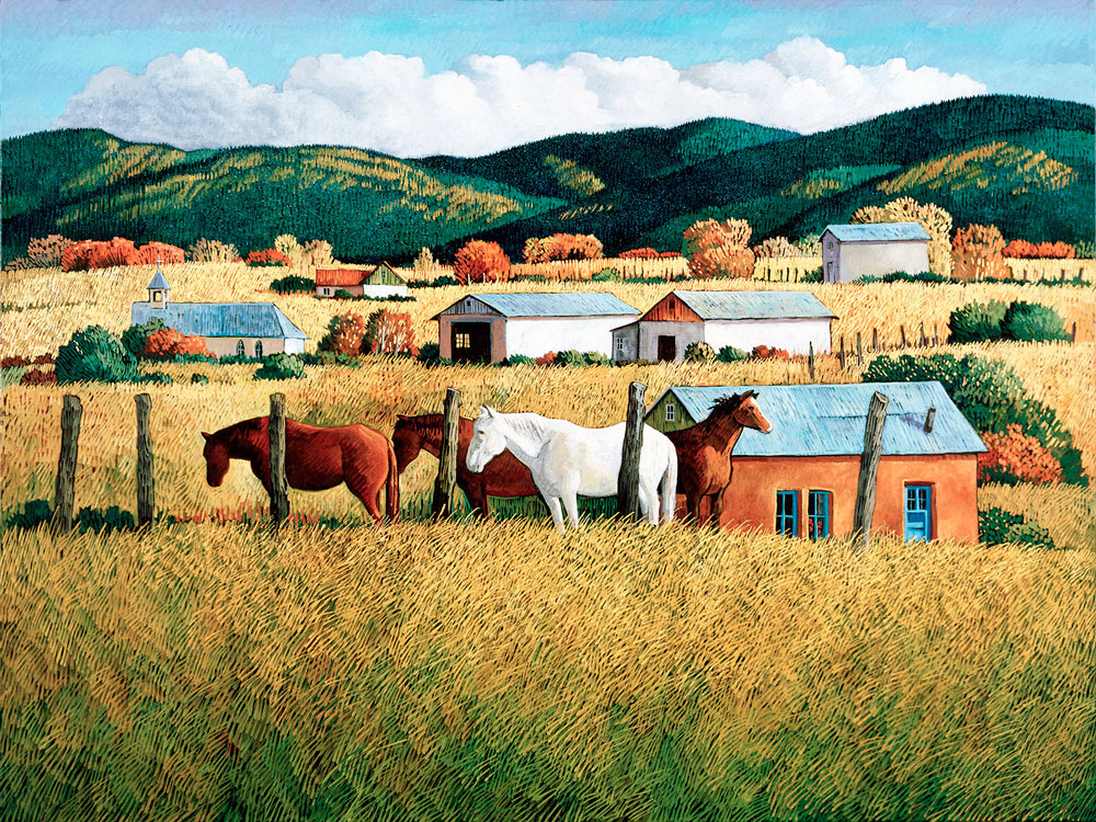 The above painting (Afternoon Visitors) was the scene from my little adobe house – the building in back of the horses is Bill Franke’s Hand Artes Gallery. One of our neighbors would let his horses run free and they roamed the village eating all the good grass along the road. This fine group appear in another painting called “Saturday Afternoon Stroll”. The painting below is the view I had from my front door “Don Gregorio’s Most Beautiful Field”. Summer, winter, fall, spring – it was a feast for the eyes – a meditation.