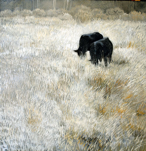 My painting “Two Cows in a Winter Field on Christmas Morning” was completed last spring. Friends Doug, Seamus and I had a wonderful eggs & green chile Christmas breakfast and then took a long drive through the villages north of Taos. I was hemmed in and couldn’t get out of the car; Seamus took the photo of a large herd of cows in a winter field. For months I stared at the photo and then isolated these two in a rather abstract composition. Finally I felt a spurt of inspiration and I began to lay in the paint. When the painting was completed, I knew that I was capable of moving into a new phase of my work. Mistakenly consigned the work to Gabe at Chimayo Trading. Two days later I was back at the gallery asking him to give it back to me. He reluctantly took it off the wall and let me have it. Good Gabe! It is still hanging in my living room and I am loathe to let it go. In my life and my work, the road ahead is a mystery. I believe this painting is a “life arrow” – a signpost.