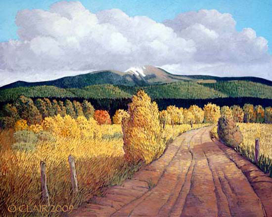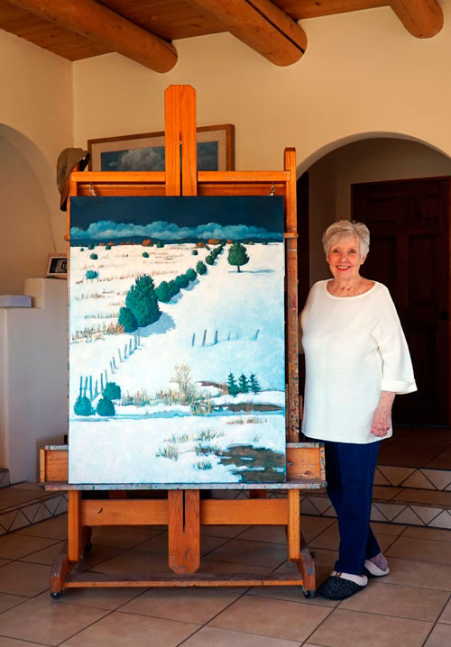 My friend and helper, Doug Yeager, took this photo this week. Posted it to my website – a note to remind myself that I can still do some large work….visions of more large paintings dancing in my head! Have wanted to do “Don Gregorio’s Winter Field” for many years. This was the view from the front door of my little adobe house the last time I lived in Truchas. Summer, winter, spring and fall – this place was my view to the eternal nature of life – a quiet mystery. And a constant surprise…sunrises, sunsets, summer storms, winter snows – changing every minute, every second. Beautifully framed, this painting now hangs on my studio wall. It is not quite the same as being there, but in completing this canvas I was able to emerge from the wilderness one more time!