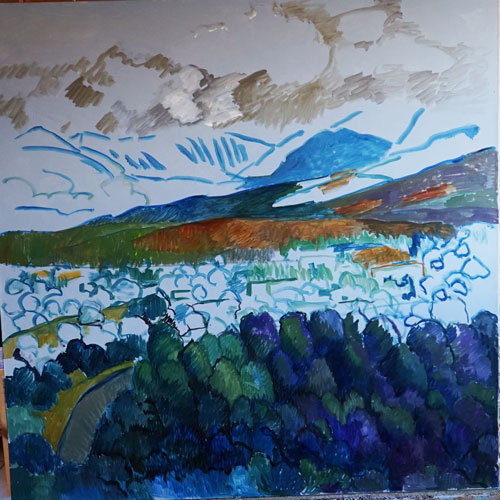 Llano Quemado, N.M. – 13 March 2020…..Taking stock today – going to give in and self-quarantine for two months. A lot of work to do – many changes. Above image is my new 40″x40″ painting of Truchas – “First Snow”. The frame has been delivered just waiting for me to complete this canvas. Another instance of “just holding the brush” – the piece seems to have a mind of its own and truly is painting itself. Love it when this happens!