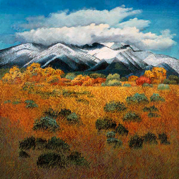 17 September 1982 – Truchas, New Mexico – The first snow on Truchas Peaks. We arrived at the horse ranch late afternoon – the small Hansel and Gretel cottage, an enormous horse barn, a mobile home and a gypsy wagon on 20 acres. At the end of the property was a gate leading to the land grant from the King of Spain. . This place was called Llano Quemado – “suburban” Truchas with a population of about seventeen stalwart souls. The snow clouds shifted and swirled with the strong winds. All the moving boxes were piled up in the horse barn. There were two huge sliding doors which opened onto a dirt road and the deep arroyo that separated us from our nearest neighbor. I sat on a ledge and watched the mountain, knowing that no matter what circumstances brought me here – this place is where I needed to be!