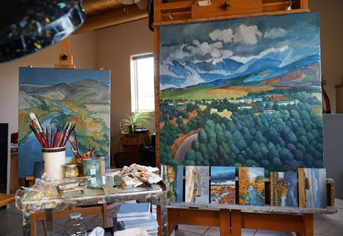 Llano Quemado Studio this morning – finished paintings and works in progress. |